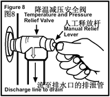 每年至少人工操作一次降溫減壓安全閥,以確保保持正常的工作狀態(tài)。為了防止水的破壞,降溫減壓安全閥必須正確連接排泄管,并通過排泄管引導(dǎo)到適當(dāng)?shù)呐盼劭凇U玖⑽恢秒x出水口要有適當(dāng)?shù)木嚯x(排泄物可能是熱的),緩慢提升并釋放降溫減壓安全閥上的杠桿手柄,使得閥門工作自如,然后重新回到關(guān)閉位置。如果閥門無法完全重置并繼續(xù)釋放出水來,請立即關(guān)閉電源和冷水進(jìn)水閥,致電擁有資格認(rèn)證的維修技術(shù)人員來維修。